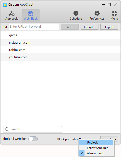 If you want to block all the porn sites and use AppCrypt as a adult blocker, you can click