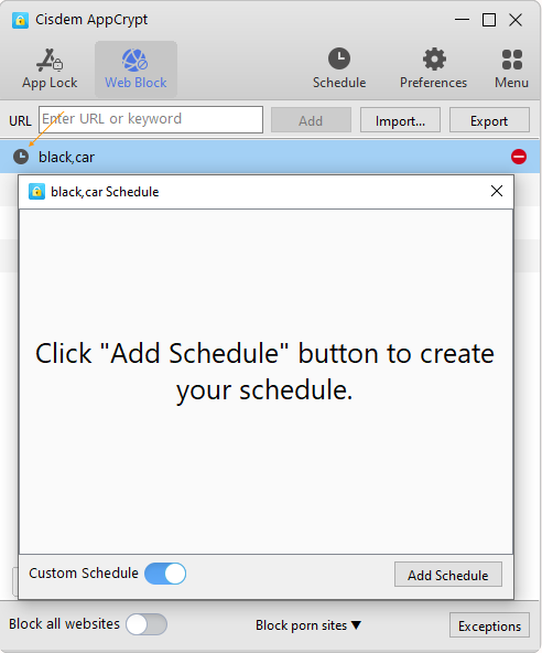 If you want to set a schedule for all the added apps and websites, you can go to the main window of Cisdem AppCrypt, click