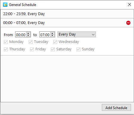 Cisdem AppCrypt blocks the added apps and websites all the time by default (the schedule is from 00:00 -23:59 every day by default), but you are also allowed to change the defaulted schedules to block those apps and websites at a certain period, you can either set a general schedule on all the apps and websites or set individual schedules on some specific apps or websites.