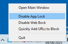 Tip: Normally, if you added the app into the App Lock list, then the app will be locked with your password unless you quit Cisdem AppCrypt, but if you want to disable the App Lock function but enable Web Block function, you can right click the padlock icon at the task bar and select "Disable App Lock".