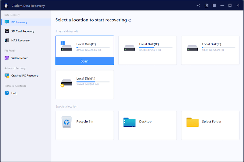 Prior to the file deletion, provided that you neither set up a backup service nor created a cloud copy, adopting a piece of specialized data recovery software becomes a viable option to restore deleted files not in Recycle Bin, like Cisdem Data Recovery for Windows.