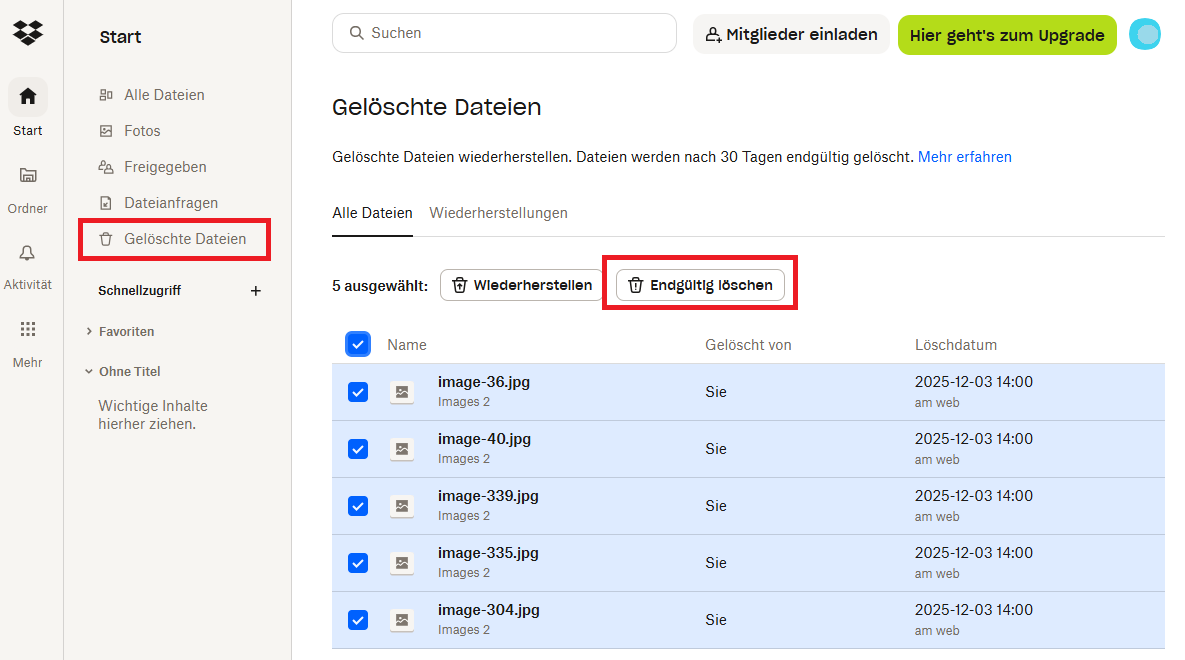 Um gelöschte Dateinen endgültig zu löschen, tippen Sie auf Gelöschte Dateien auf der linken Seitenleiste. Klicken Sie anschließend auf Endgültig löschen.