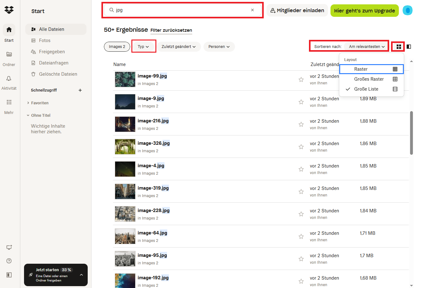- Öffnen Sie einen Ordner, in dem doppelte Dateien vorhanden sind. Geben Sie Schlüsselwörter oder Tags (falls Sie sie hinzugefügt haben) in das Suchen-Feld ein. Dann tippen Sie auf Typ und wählen z.B. Bilder oder PDFs aus, wenn der Ordner aus verschiedenen Dateitypen bestanden wird. Falls es um Bilder geht, klicken Sie auf den Dopdown-Menü von Sortieren nach, tippen dann auf Am relevantesten, damit ähnliche Bilder zusammen angeordnet werden. Um die Bilder klarer zu sehen, tippen Sie auf Layout und wählen Raster aus.