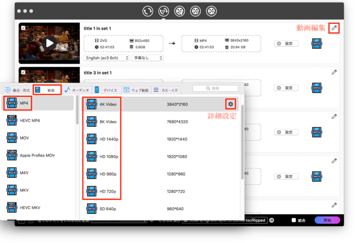 オリジナルのパラメータ(解像度、フレームレート、アスペクト比など)がデフォルトで保留されます。それらを調整したい場合、選択されたフォーマットの横にある