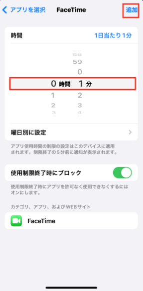 - 「使用制限終了時にブロック」を有効にします。制限時間が終了すると、自動的にアプリがブロックされます。