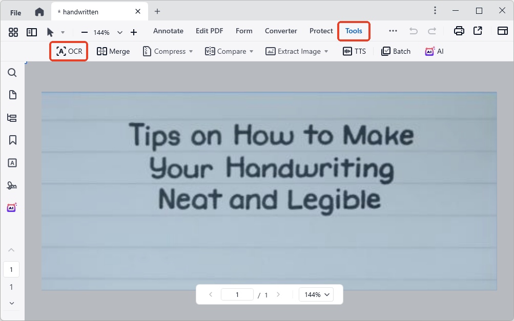 - When the PDF is imported, select Tools feature from the top toolbar and click OCR.