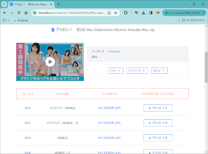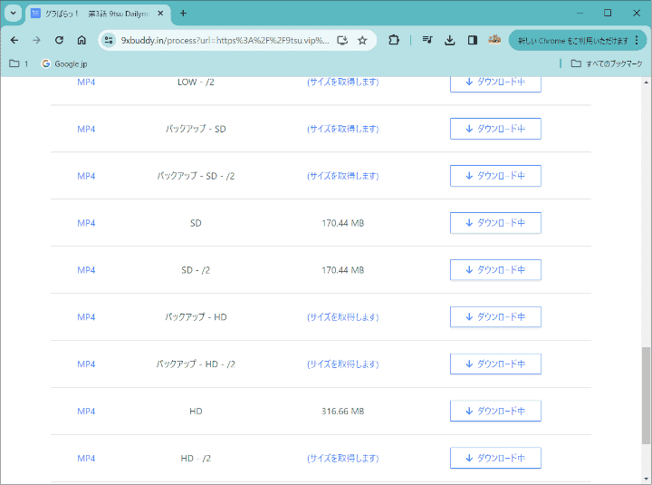 - ダウンロードできるファイルがたくさん表示されますが、一般的には、「LOW」「SD」「HD」などの文字があるのが本当の9TSU動画ファイルです。「サイズを取得します」をクリックすれば、そのファイルサイズを確認できます。必要とする画質のファイルを選んで、右にある「ダウンロード中」ボタンをクリックします。