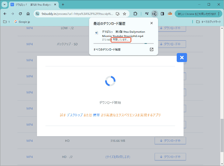 9XBUDDYと同じく、ダウンロード中にずっと「再開しています」が表示されています。スピードは9XBUDDYより少しだけ速いですが、500MBの動画をダウンロードするにも40分以上かかってしまいました。