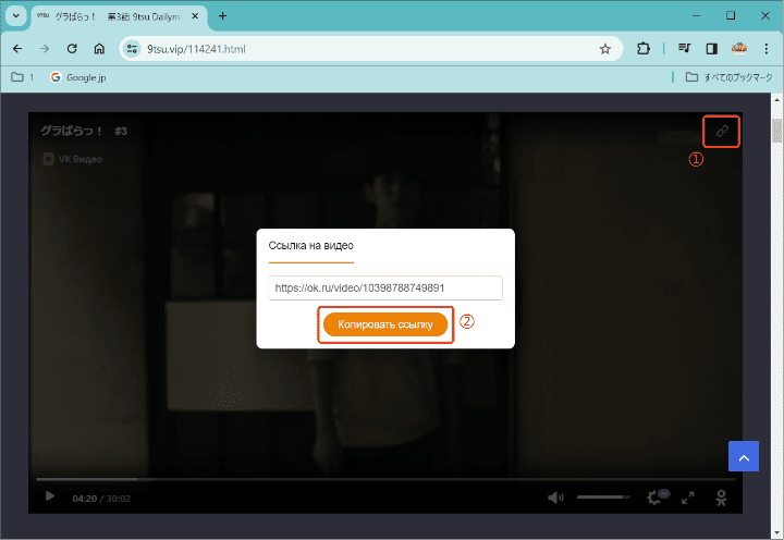 ステップ 3. ブラウザで好きな9TSU動画ページに入り、動画を再生します。再生開始後、動画の右上隅にあるアイコンが表示されますので、そのアイコンをクリックすることで9TSU動画のURLをコピーできます。