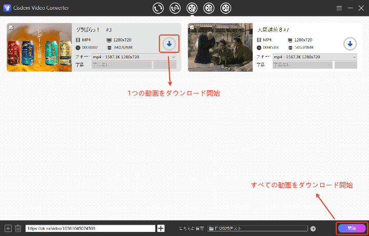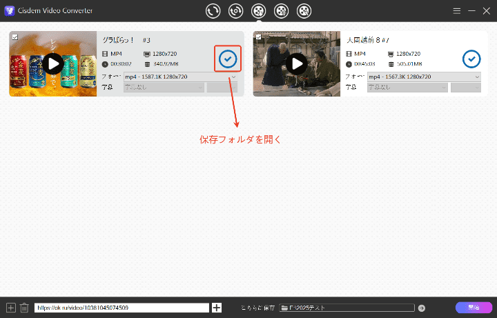 Cisdem Video Converterのダウンロードスピードが速く、2つの動画(合計800MB以上)をダウンロードするには2分もかかりませんでした。ダウンロード完了後、チェックボタンをクリックすることで動画の保存フォルダを開けます。