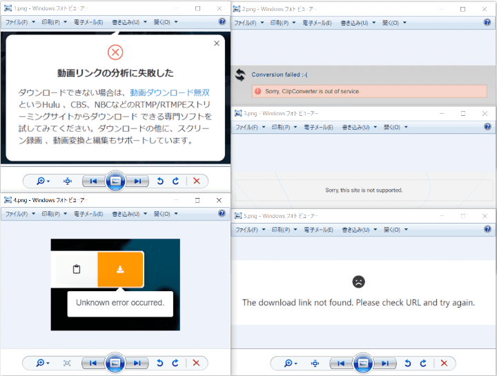 本当に無料かつソフトインストール不要で動画をダウンロードできるオンラインサイトがますます減っている現在、9TSU動画に対応できるサイトもさらに見つけにくくなっています。下記のように、「分析に失敗した」「対応できないサイト」「エラーが起きた」などが表示されるサイトが多いです。