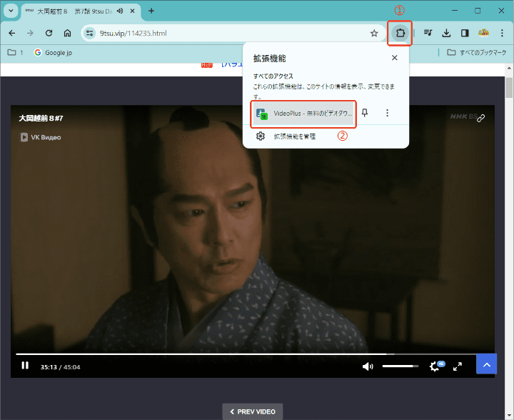 そしてURL欄の右にある拡張機能アイコンをクリックして、VideoPlusをクリックします。