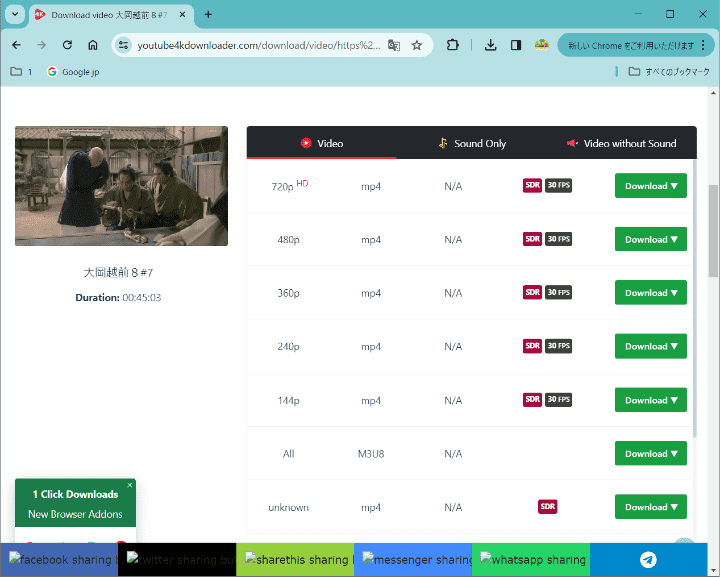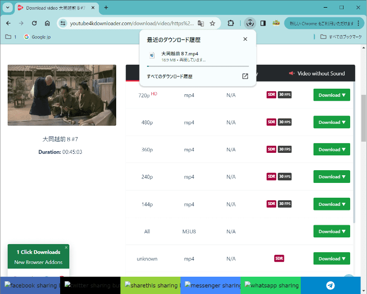 - 分析完了後、ダウンロードできる画質が表示されます。右の「ダウンロード」ボタンをクリックして、保存場所を選択し、保存ボタンをクリックすればダウンロードできます。