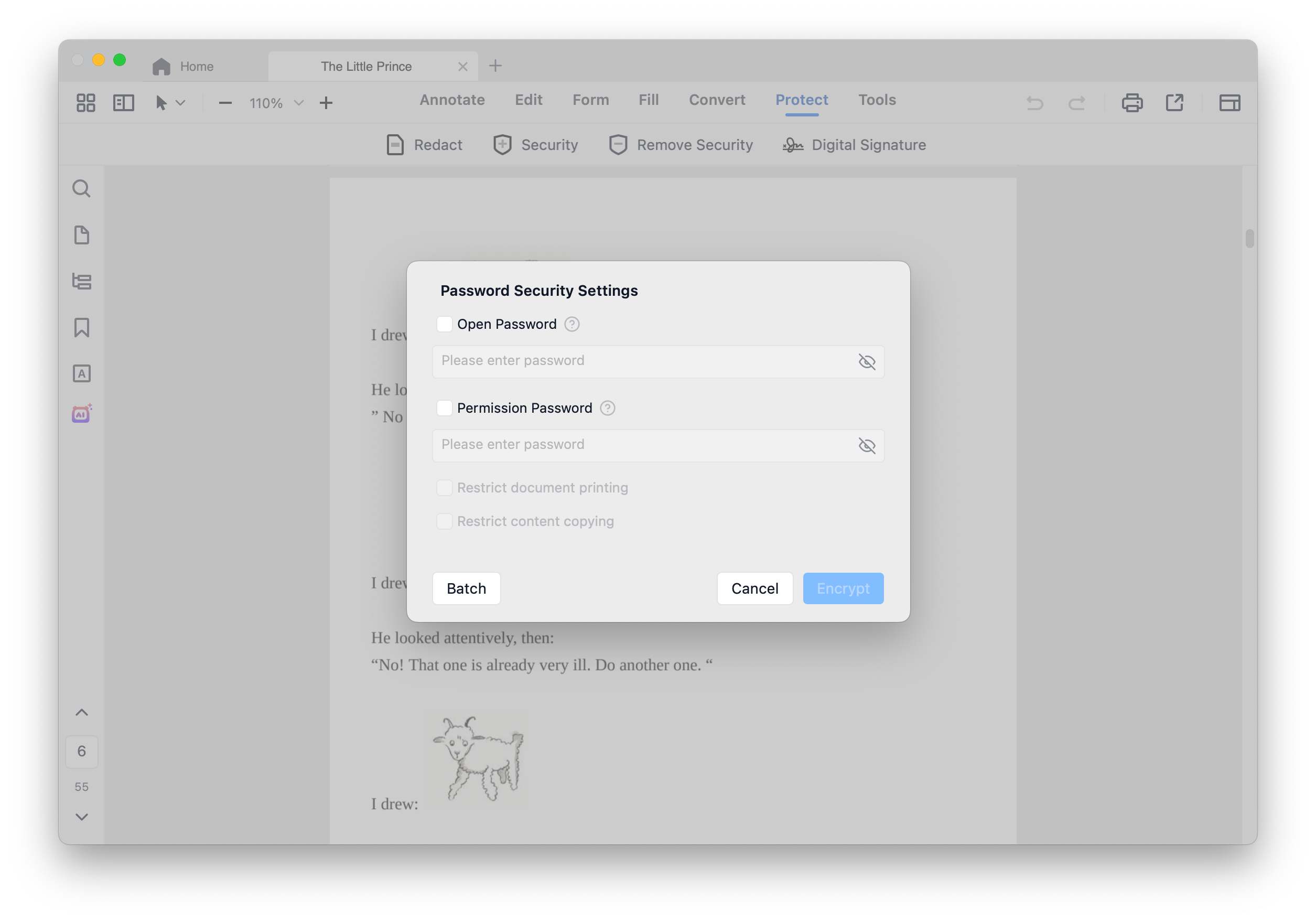 - Go to Protect > Security, you can set password to resctrict access to open or edit the PDF file.