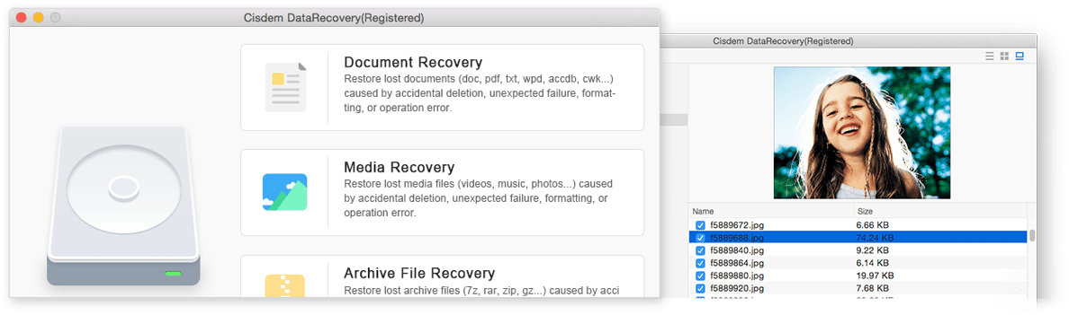 Cisdem DataRecovery, a safe and effective data recovery software, retrieves your lost videos, photos, music, documents, emails, etc. from your PC's hard drive as well as from USB drives, external hard drives, and other storage devices.