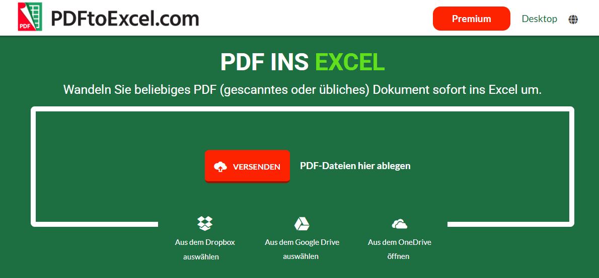 pdftoexcel.com wurde speziell für die Konvertierung von nativen und gescannten PDFs in Excel entwickelt. Sie können PDF-Dateien von Mac, Google Drive, Dropbox und OneDrive hochladen. Und die Konvertierung erfolgt recht schnell.