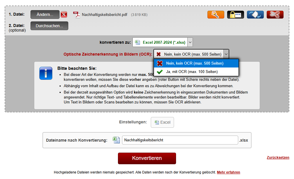 - Wählen Sie Ausgabe als Excel und wählen Sie OCR, wenn Sie eine gescannte Datei hochgeladen haben.