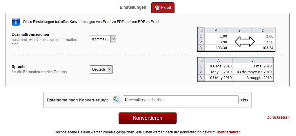- Klicken Sie auf Excel neben "Eintsellungen", wählen Dezimaltrennzeichen und Sprache. Benennen die Datei um, wenn nötig.