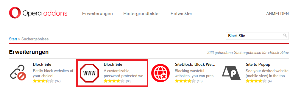 3. Suchen Sie in dem neuen Fenster nach Block Site. Wählen Sie aus den Ergebnissen die Erweiterung mit den 3 "W" im Symbol.