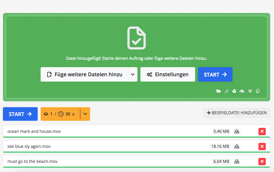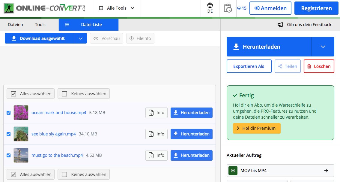 Die für die Konvertierung benötigte Zeit hängt von der Geschwindigkeit der eigenen Internetverbindung, der Größe der hochgeladenen Dateien und auch davon ab, wie ausgelastet der Server sind.