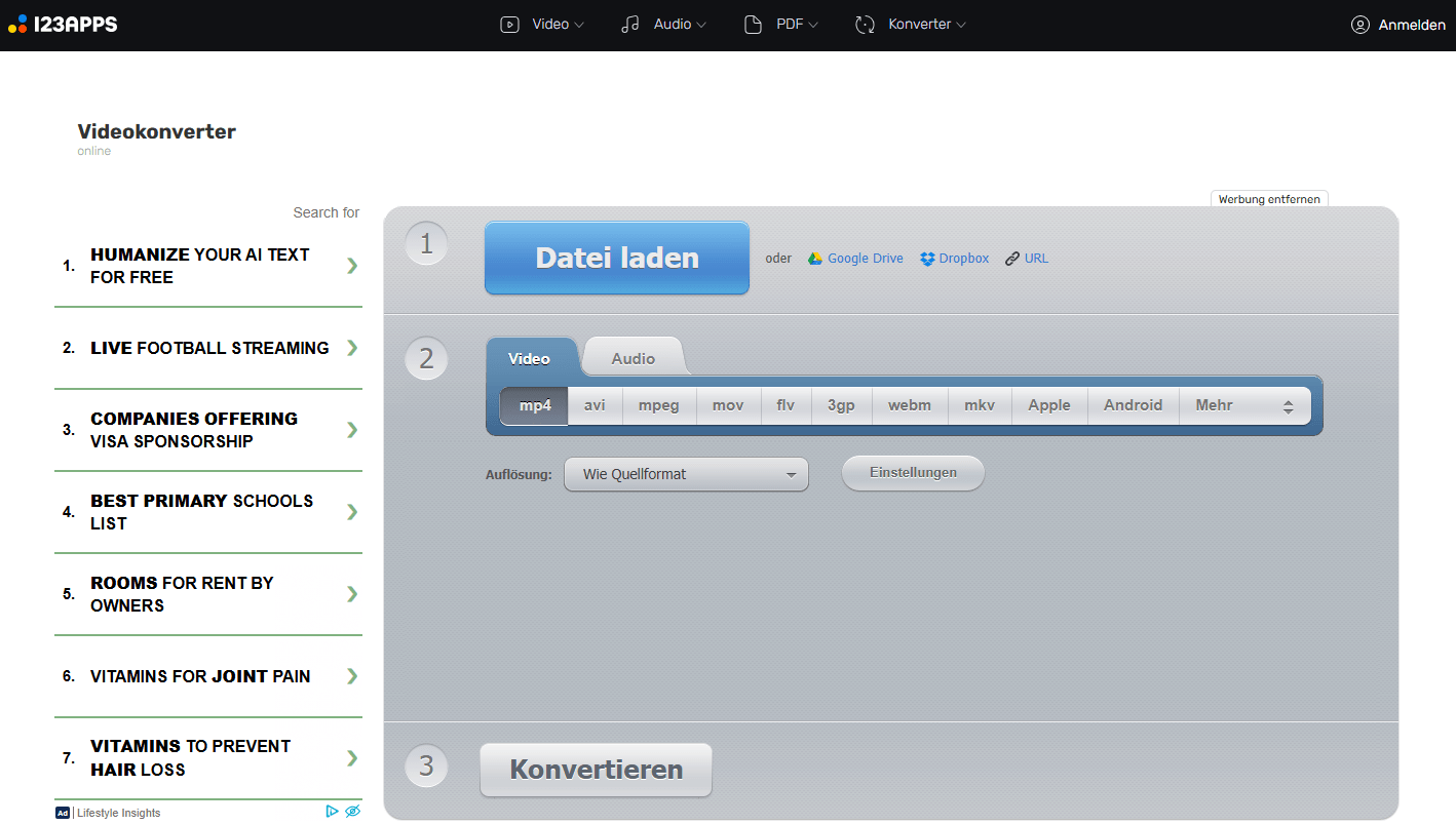 Video-Converter.com verfügt über eine ganz klare Benutzeroberfläche, die aus 3 Teile ( Knopf „Datei laden“, Video- und Audioformat, Knopf „Konvertieren“) besteht. Aber der Converter ist nicht werbefrei. Um Anzeigen zu entfernen, müssen Nutzer 39 $ pro Monat oder 384 $ pro Jahr zahlen. Meiner Meinung nach ist es nicht notwendig, weil die Werbung nicht auf der Benutzeroberfläche angezeigt werden, sondern nur drumherum.