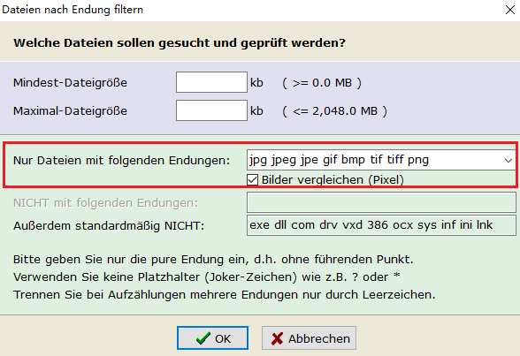 5. Wählen Sie dann „Namen vergleichen“ oder „Inhalte vergleichen“. Die beiden Suche-Methoden lassen sich auch kombinieren. Hier wähle ich „Inhalte vergleichen“, „Byte für Byte“ und lege die minimale Übereinstimmung auf 60% fest.