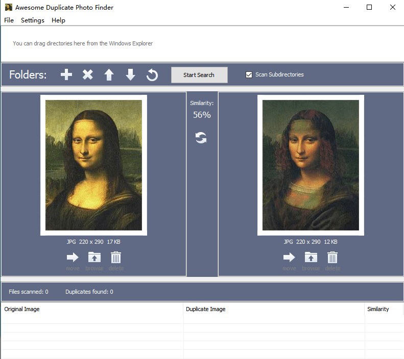 Awesome Duplicate Photo Finder, eine kleine (Größe: 2 MB) aber feine Freeware, beschäftigt sich mit dem Finden und Löschen doppelter Fotos. Anzeigen, Malware, Spyware, Pop-ups sind absolut nicht erhältlich. Ähnliche Bilder kann sie auch suchen, indem man die Option „Search Only 100% Identical Pictures“ im „Settings“-Fenster abwählen.