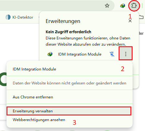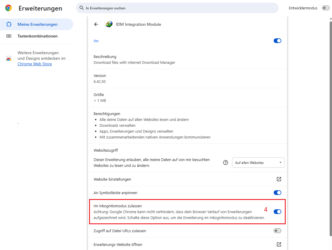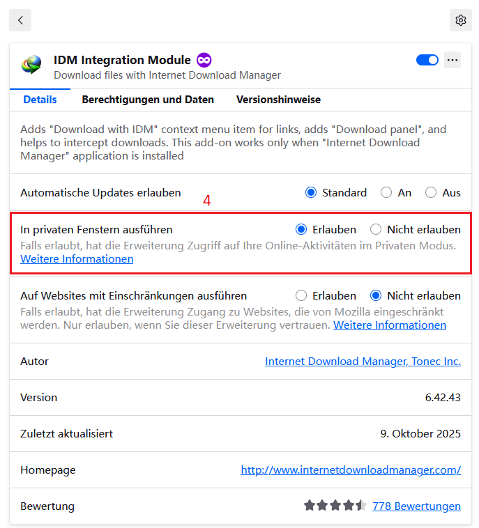 ---In dem zweiten Fenster geht es darum, dass Sie „IDM Integration Module“ installieren müssen, um es zu Firefox hinzuzufügen, indem Sie in dem geöffneten Firefox-Tab auf den Button „Zu Firefox hinzufügen“ klicken. Nach dem Installation aktivieren Sie „In privaten Fenstern ausführen“.