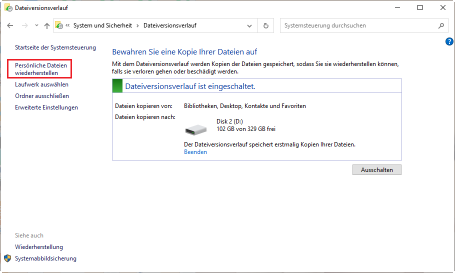 Option 2. Dateien über den Dateiversionsverlauf wiederherstellen