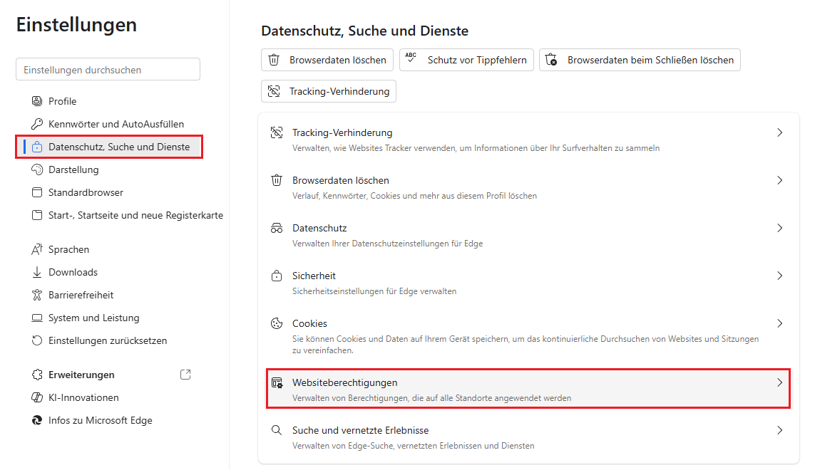 3. Wählen Sie Datenschutz, Suche und Dienste > Websiteberechtigungen.