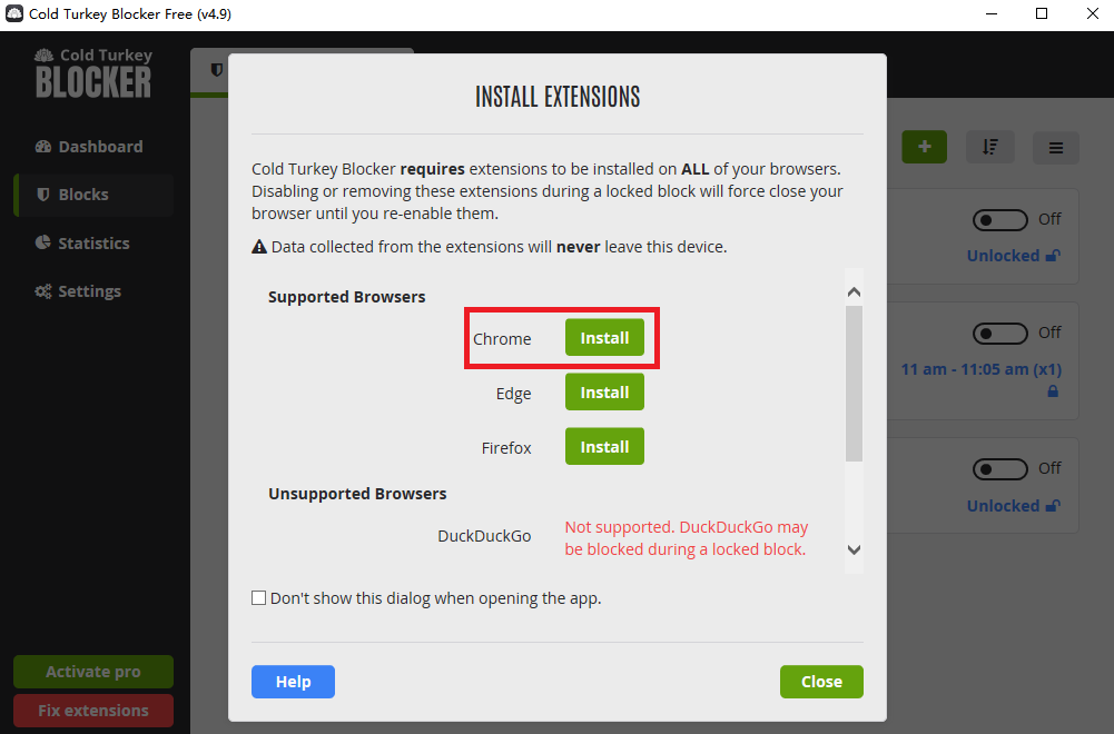 2. Nach der Installation wird der Blocker automatisch geöffnet. Klicken Sie auf Install neben Chrome, dann folgen Sie der Hinweise, um die Erweiterung zu installieren und die Option "Im Inkognitomodus zulassen" zu aktivieren.