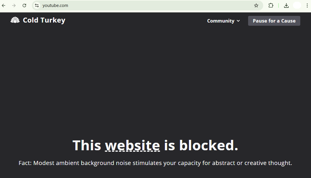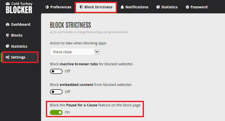 Um die Option nicht anzuzeigen, klicken Sie auf Settings > Block Strictness, aktivieren Sie Block the Pause for a Cause feature on the block page.