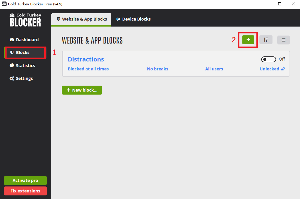 3. Klicken Sie danach auf Blocks auf der linken Seitenleiste, dann tippen auf das grüne Pluszeichen oder New block..., um eine neue Liste zu erstellen. Sie können auch auf den Namen Distractions direkt klicken, dann fügen Websites darin hinzu.
