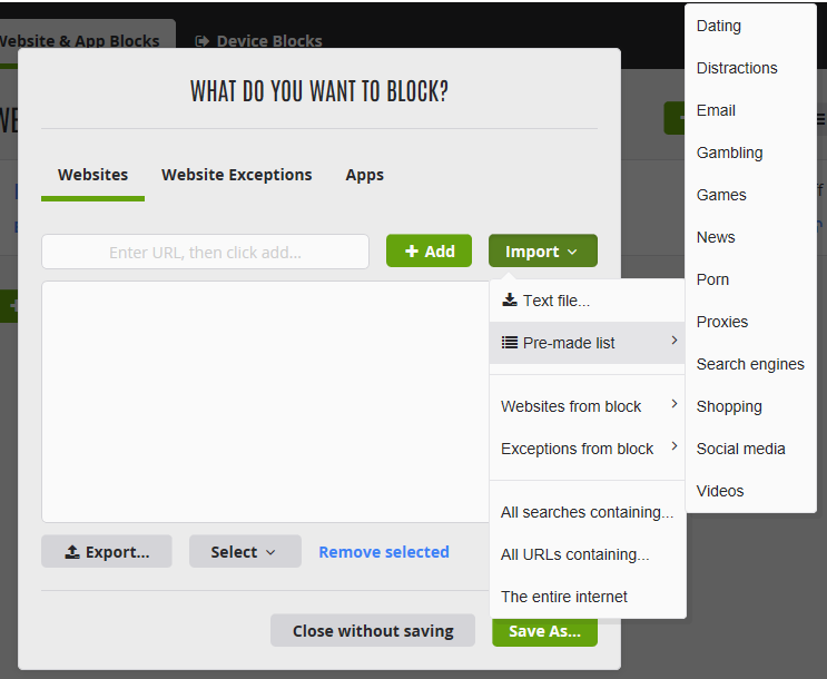 5. Auf der Registerkarte Web-Sperre fügen Sie bestimmte URLs hinzu oder importieren Kategorien von Websites, die Sie blockieren möchten.