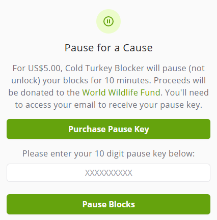 Ein Klick auf Pause for a Cause entsperrt die Website für 10 Minuten, solange Sie Pause Key kaufen.