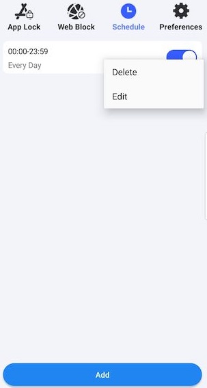 4. Wenn Sie die Webseiten zu bestimmten Zeiten blockieren, tippen Sie auf Schedule. Bearbeiten Sie den voreingestellten Zeitplan oder löschen Sie ihn direkt und fügen Sie einen neuen hinzu.
