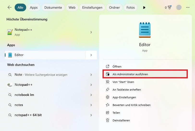 2. Klicken Sie mit der rechten Maustaste darauf und wähle Als Administrator ausführen.