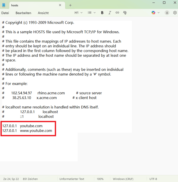 8. Fügen Sie in neuen Zeilen Ihre lokale IP-Adresse 127.0.0.1 mit der Domain der Website ein (z. B. 127.0.0.1 www.beispiel.de), die Sie blockieren möchten.