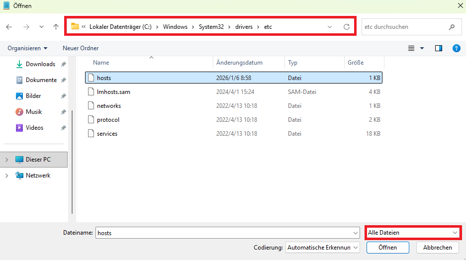 5. Wenn Sie etc öffnen und keine Datei hosts sehen, ändern Sie unten rechts bei Dateityp von Textdateien (.txt) auf Alle Dateien.