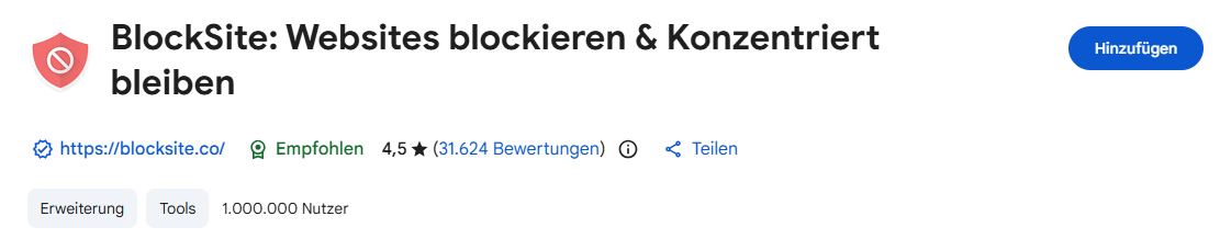 - Chrome-Erweiterung installieren, z. B. BlockSite. (Sie verfügt über ähnliche Funktionen wie AppCrypt, aber ist leicher zu entfernen)