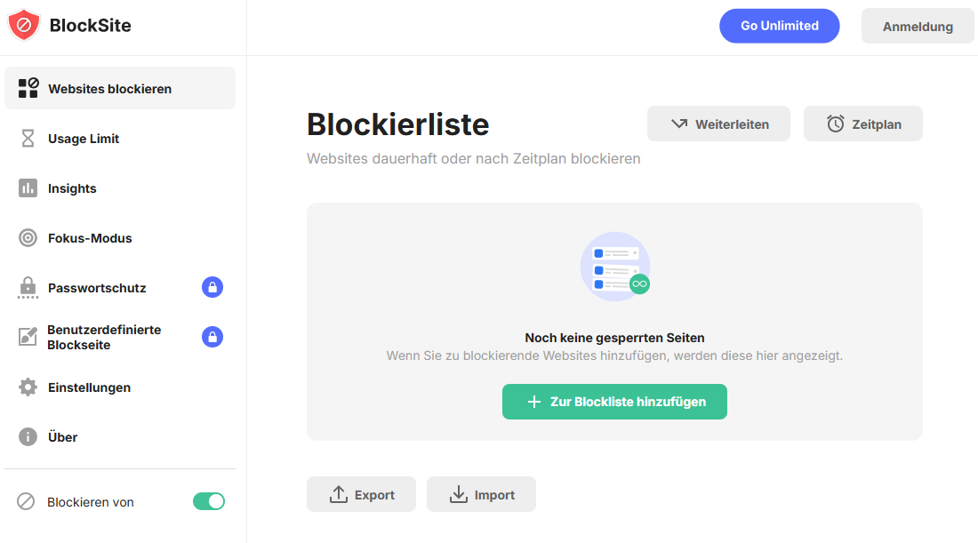 BlockSite ist eine empfohlene Erweiterung, mit der Websites nach Kategorien oder durch das Hinzufügen von Stichwörtern bzw. URLs blockiert werden können. Nutzer können zudem die Nutzungsdauer für blockierte Webseiten begrenzen; ein Passwortschutz ist ebenfalls verfügbar.