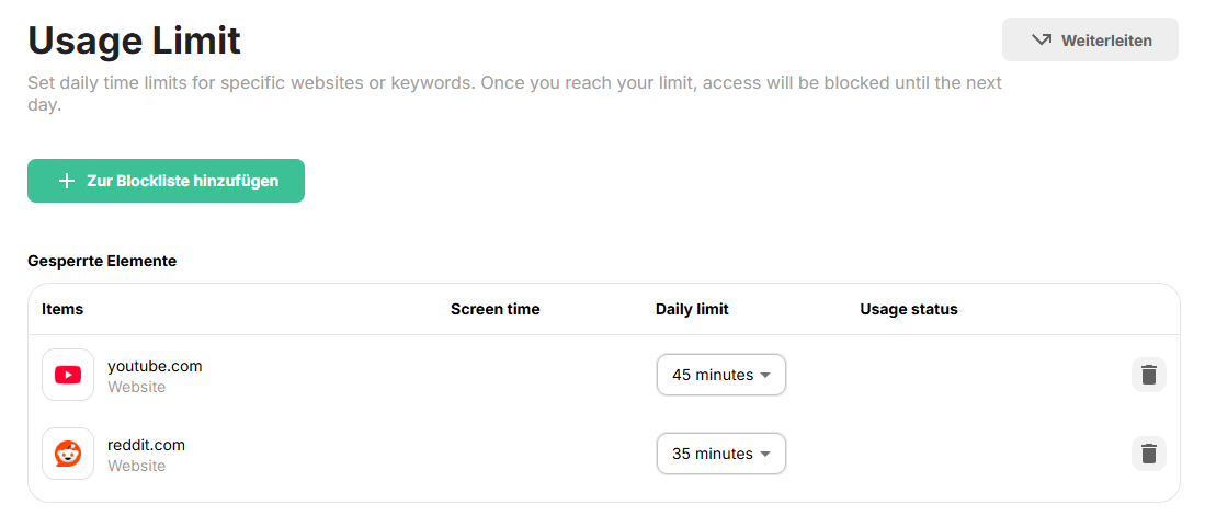 Sie können auch in der linken Seitenleiste auf Usage Limit tippen, fügen Sie anschließend Websites hinzu und legen Sie ein tägliches Limit fest.
