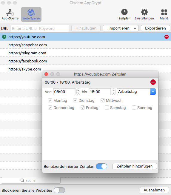 Um eine Website nicht permanent, sondern nur zu bestimmten Zeiten zu sperren, können Sie die Zeitplan-Funktion von AppCrypt verwenden. Gehen Sie zuerst zu Web-Sperre, wählen Sie die gewünschte Website aus und klicken Sie auf das Uhrsymbol neben der ausgewählten Website. Dann aktivieren Sie Benutzerdefinierter Zeitplan und klicken Sie auf Zeitplan hinzufügen, um einen oder mehrere Zeitpläne zu erstellen.