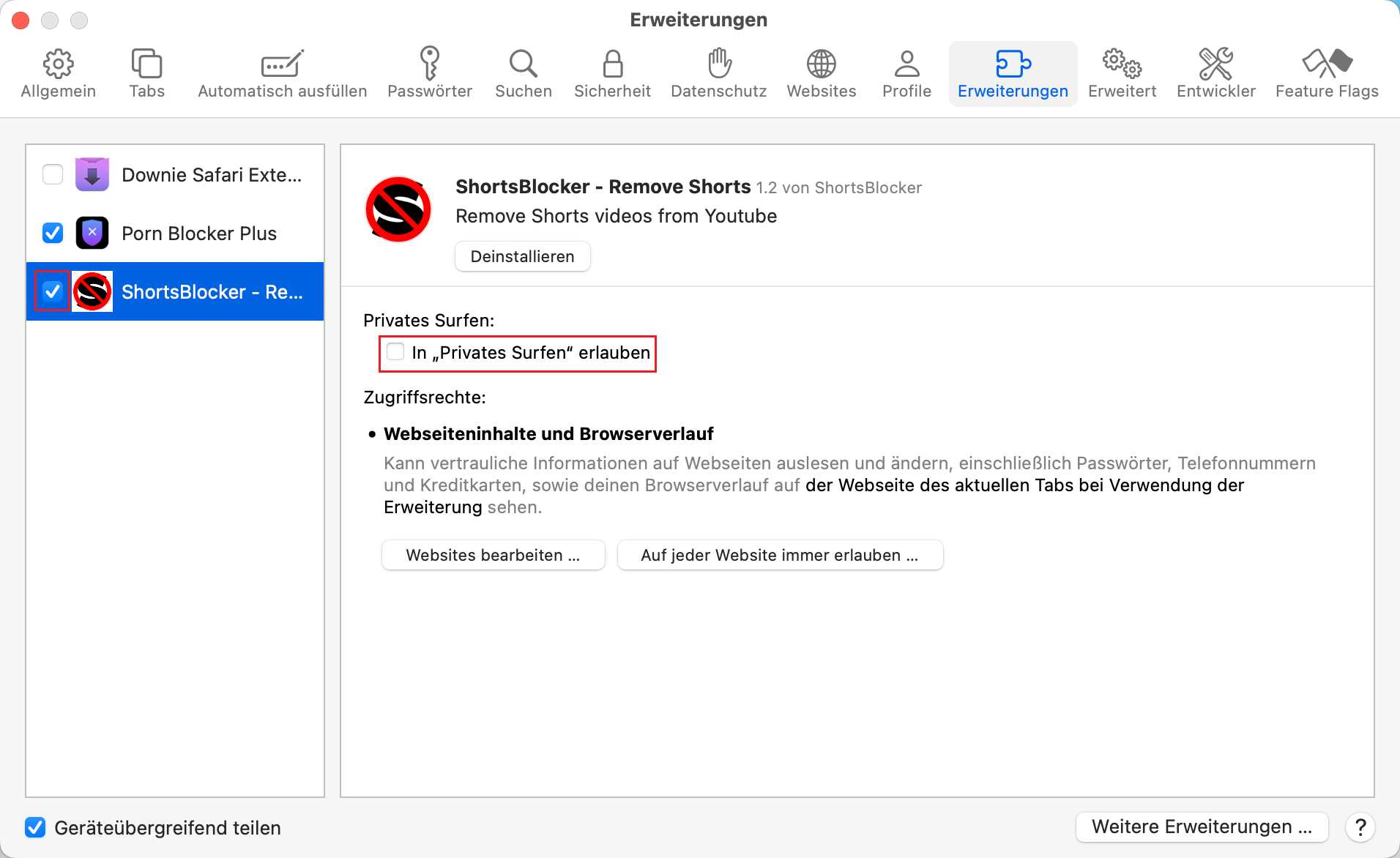 5. Kreuzen Sie die Box neben ShortsBlocker an und erlauben Privates Surfen.