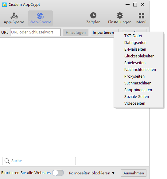 Cisdem AppCrypt ist ein Website-Sperrtool für Windows- und Mac-Nutzer, das YouTube Shorts auf Desktop dauerhaft deaktivieren kann. Wenn Sie für Shorts süchtig sind, können Sie dieses Tool bedienen, um den Zugriff auf Shorts währen der Arbeitszeit/Schlafenszeit zu deaktivieren. Dann schauen Sie YouTube Shorts in anderer Zeit an, aber Shorts wird gesperrt, wenn Sie produktiv bleiben oder schlafen müssen.