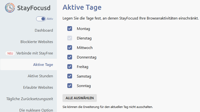 Schritt 5. Tippen Sie auf Aktive Tage. Legen Sie die Tage fest, an denen StayFocusd youtube.com einschränkt.