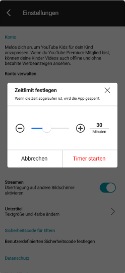 Falls Sie die YouTube-Nutzungszeit für Ihr Kind begrenzen möchten, legen Sie am besten einen Code fest.