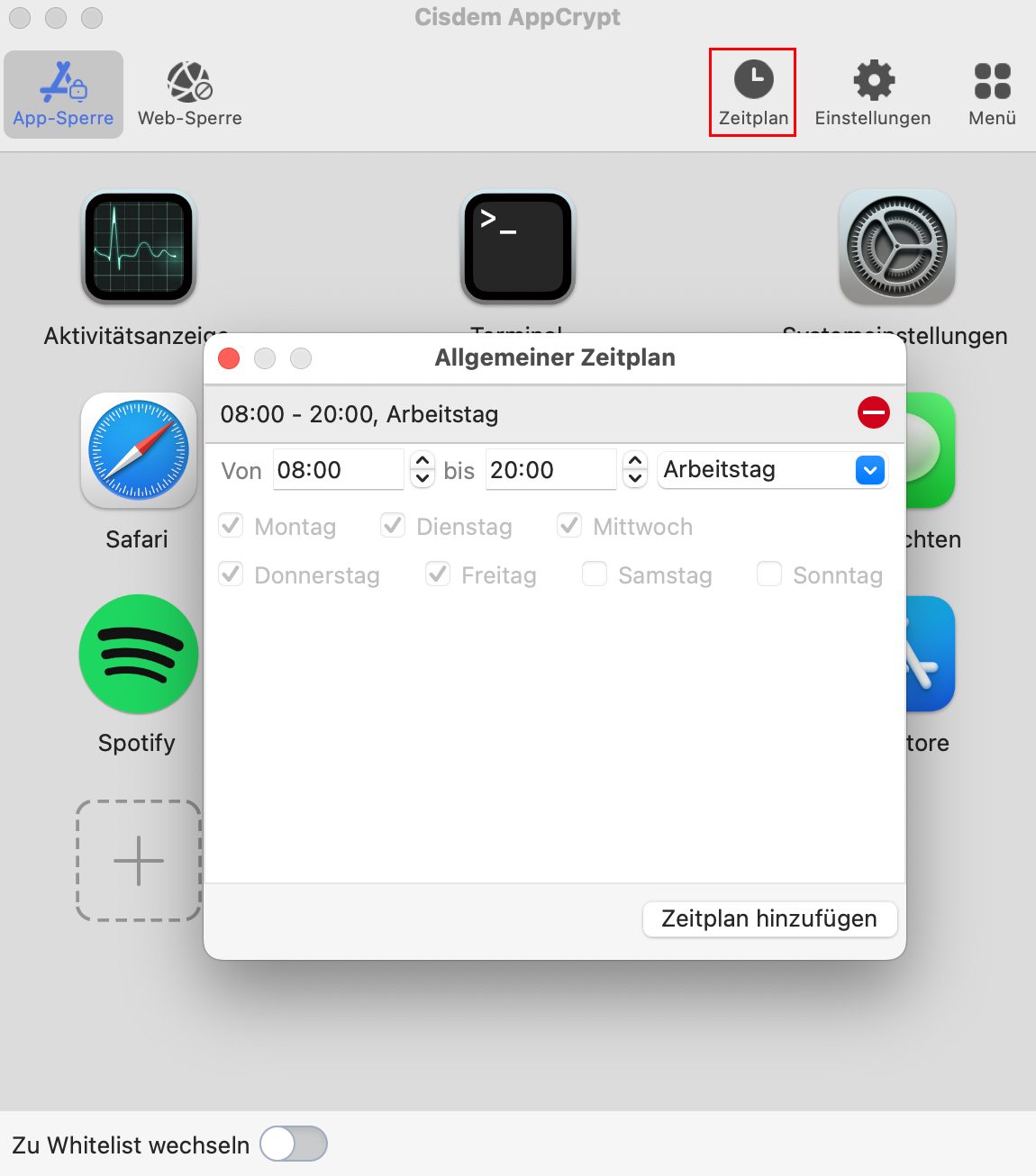 Sie können auch einen Zeitplan für alle hinzugefügte Apps einrichten, indem Sie auf Zeitplan (oben rechts) klicken.