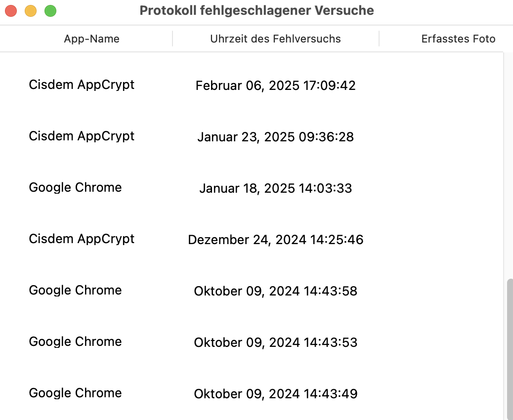 - Fehlgeschlagene Versuche erfassen, geschützte Programme zu öffnen, mit App-Name, Uhrzeit und Fotos von Eindringlingen