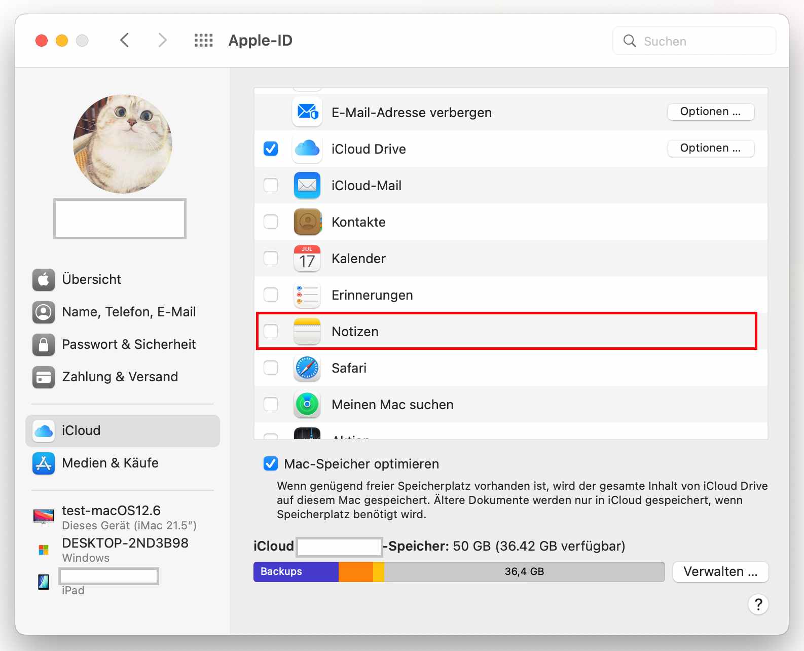 - Klicken Sie auf iCloud. Wählen Sie das Kontrollkästchen vor Notizen ab (Notizen muss aktiviert sein).